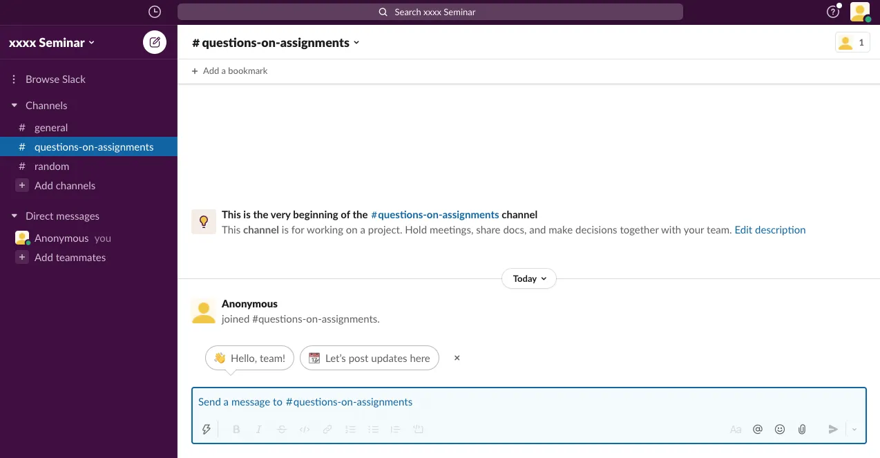 - If you want to share information only with faculty members and TAs, you can set up a private channel (See Convert a channel to private (Slack help center)).
